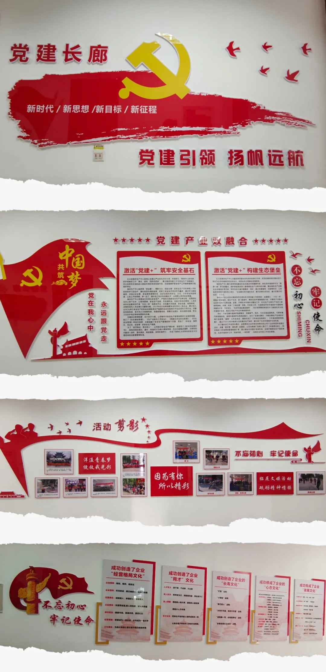 經(jīng)過(guò)精心設(shè)計(jì),新打造的黨建文化墻以“不忘初心、牢記使命”為主線,統(tǒng)籌兼顧“聚焦紅太陽(yáng)雙主業(yè)”和“創(chuàng)新復(fù)興”戰(zhàn)略,將黨建文化與生產(chǎn)工作、員工生活相結(jié)合,突出“黨建+”,打造南生化別樣的文化“風(fēng)景線”。