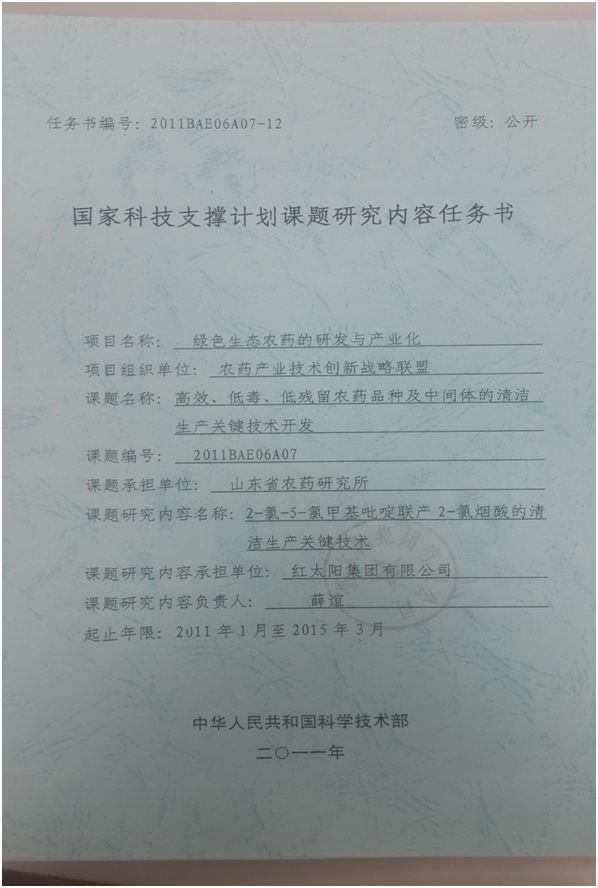 十二五科技計(jì)劃項(xiàng)目證書(shū)
